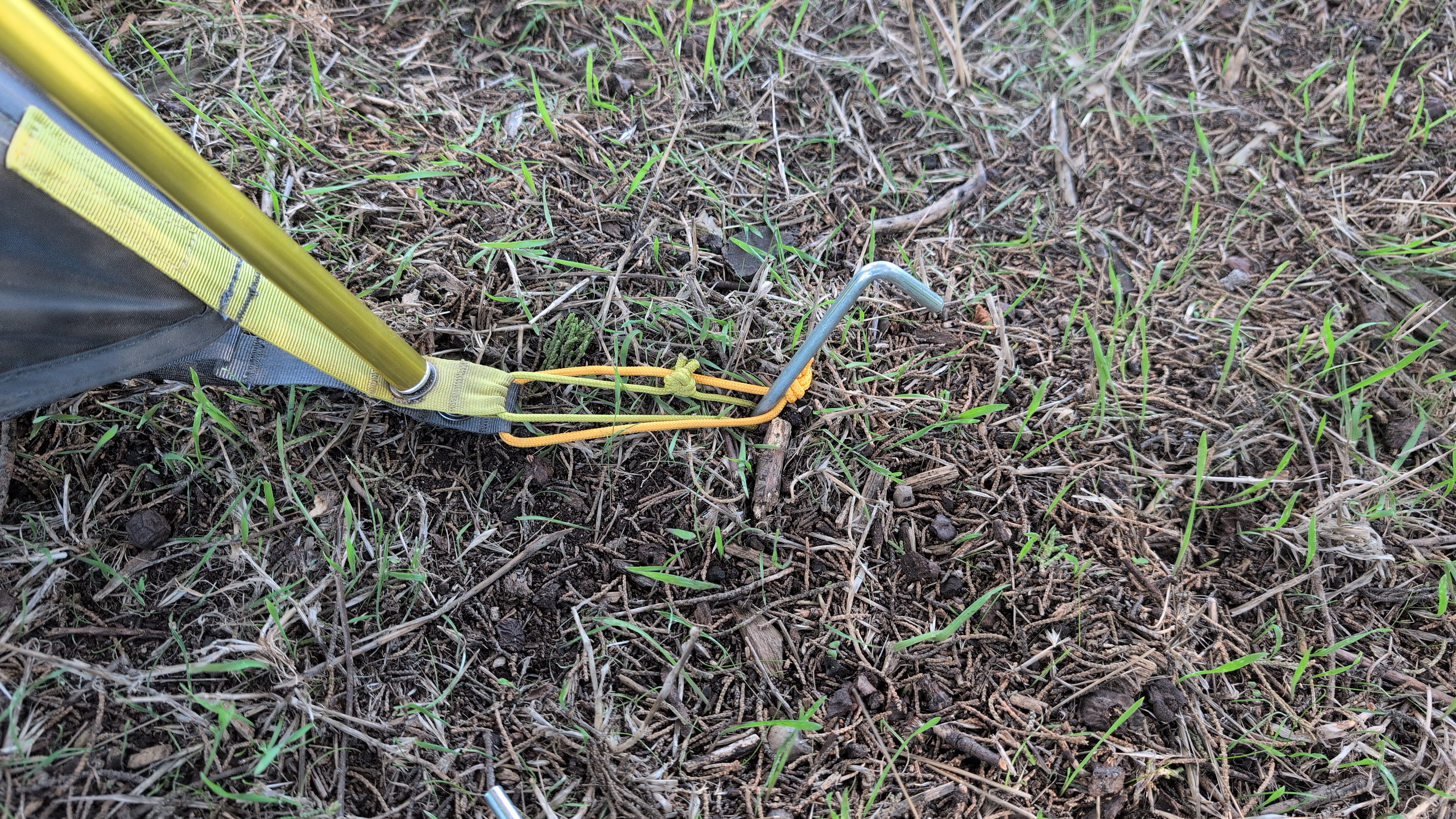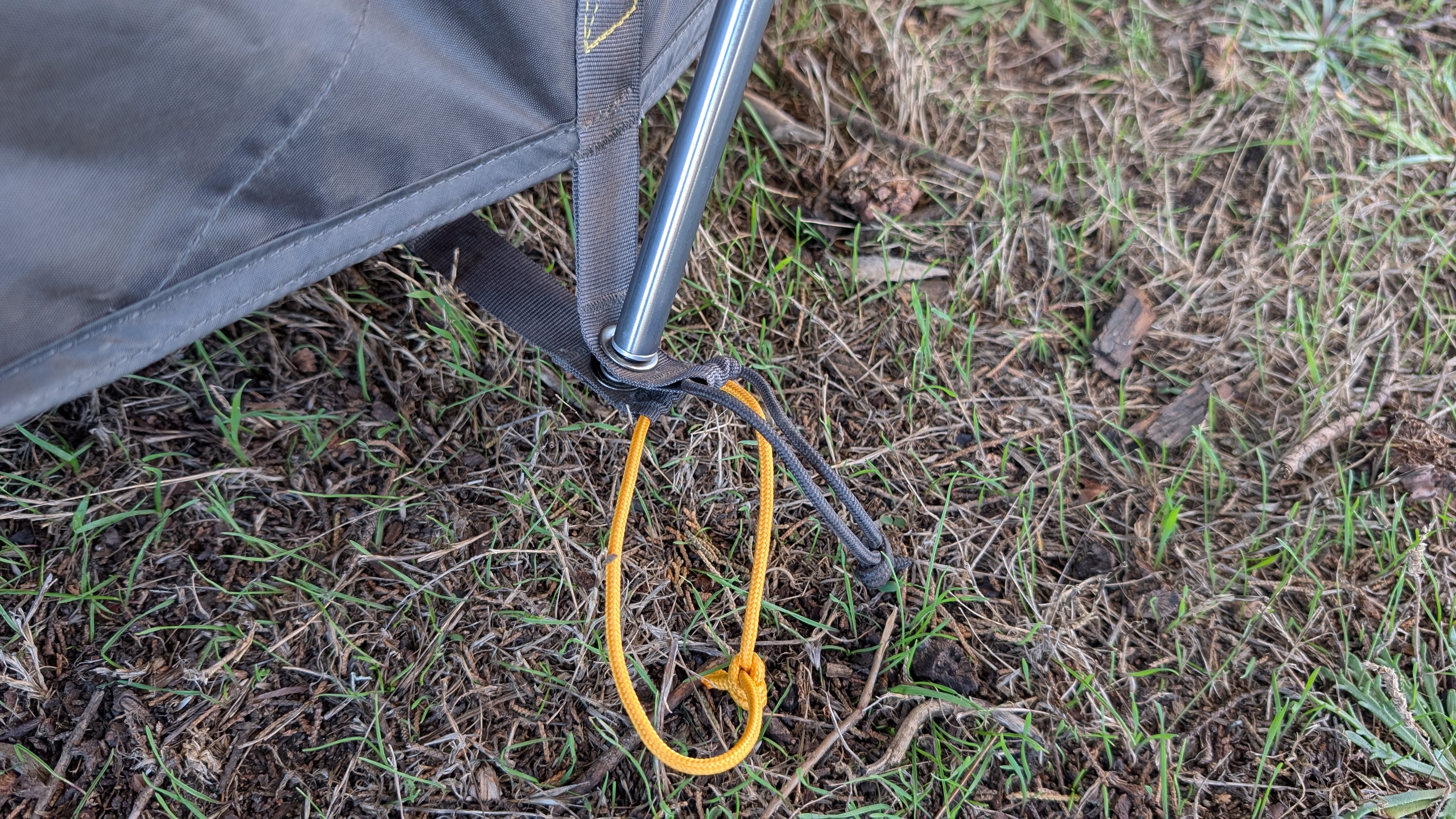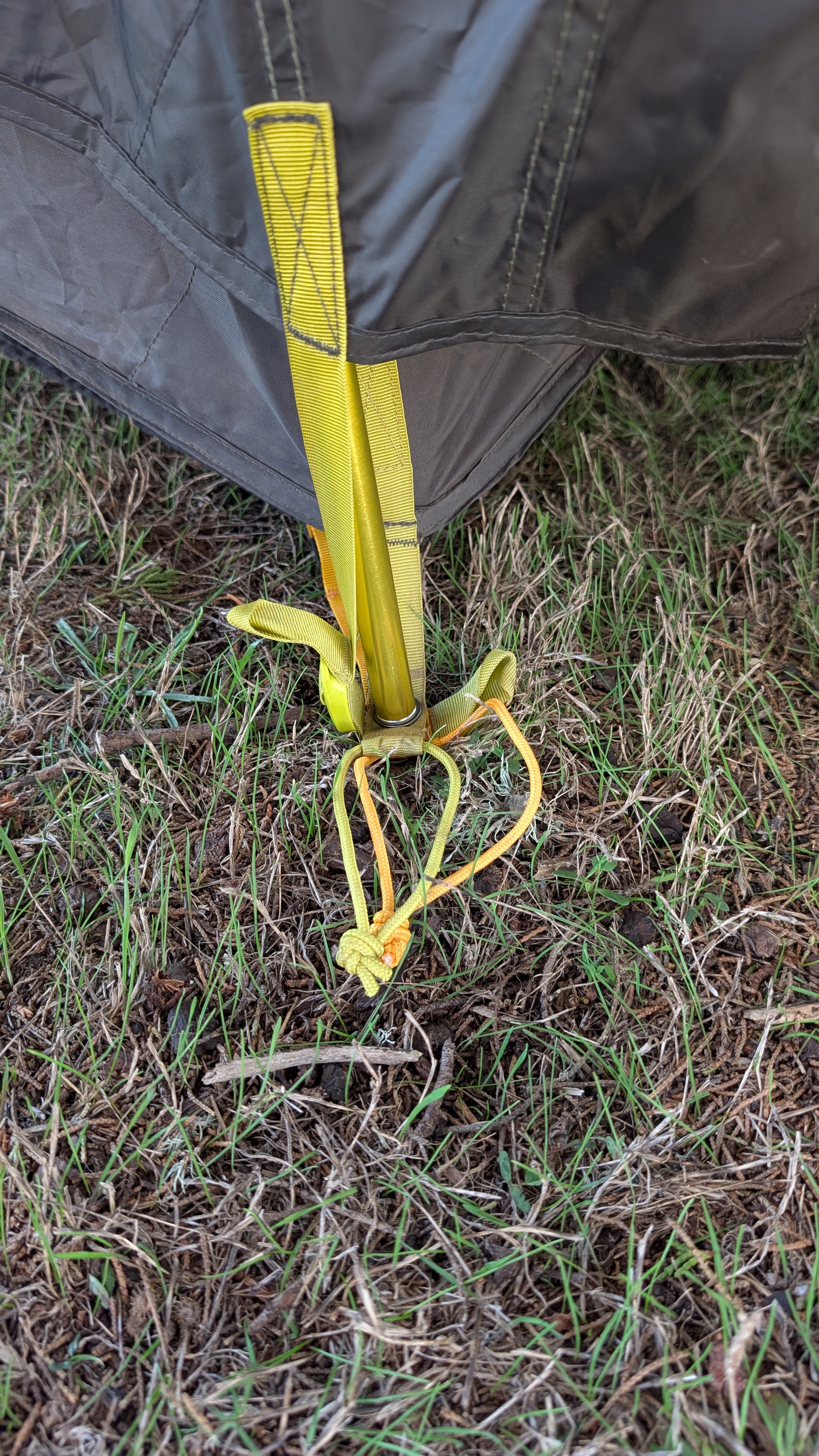 Staking this grommet first anchors the vestibule to the tent body and creates proper tension for the rest of the staking sequence.