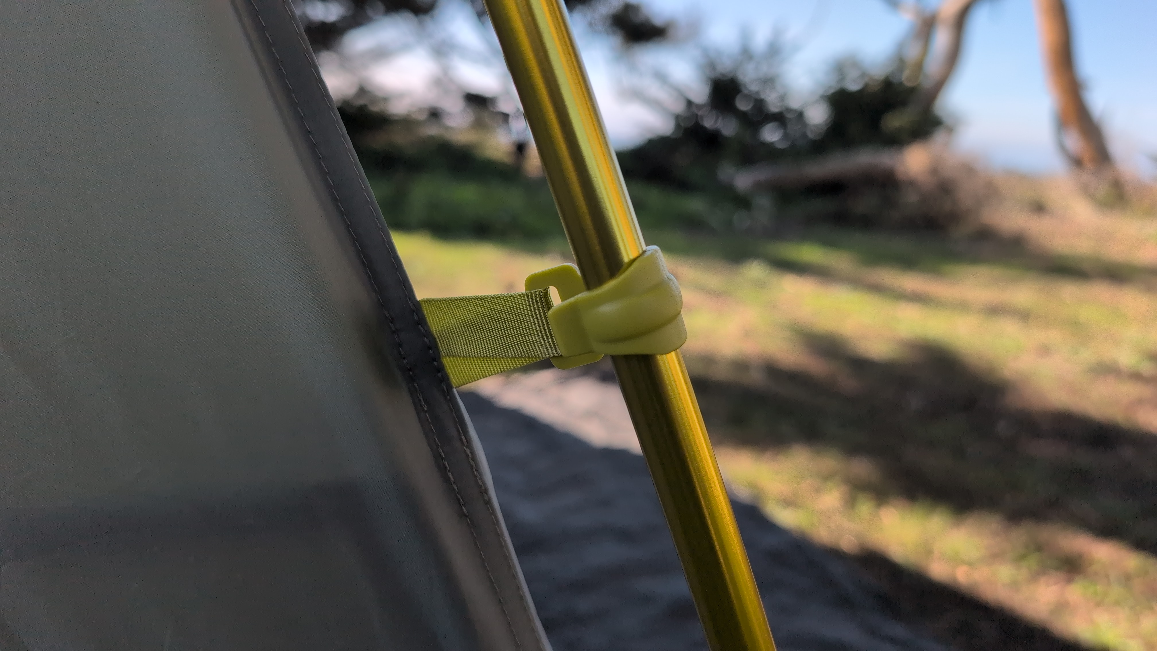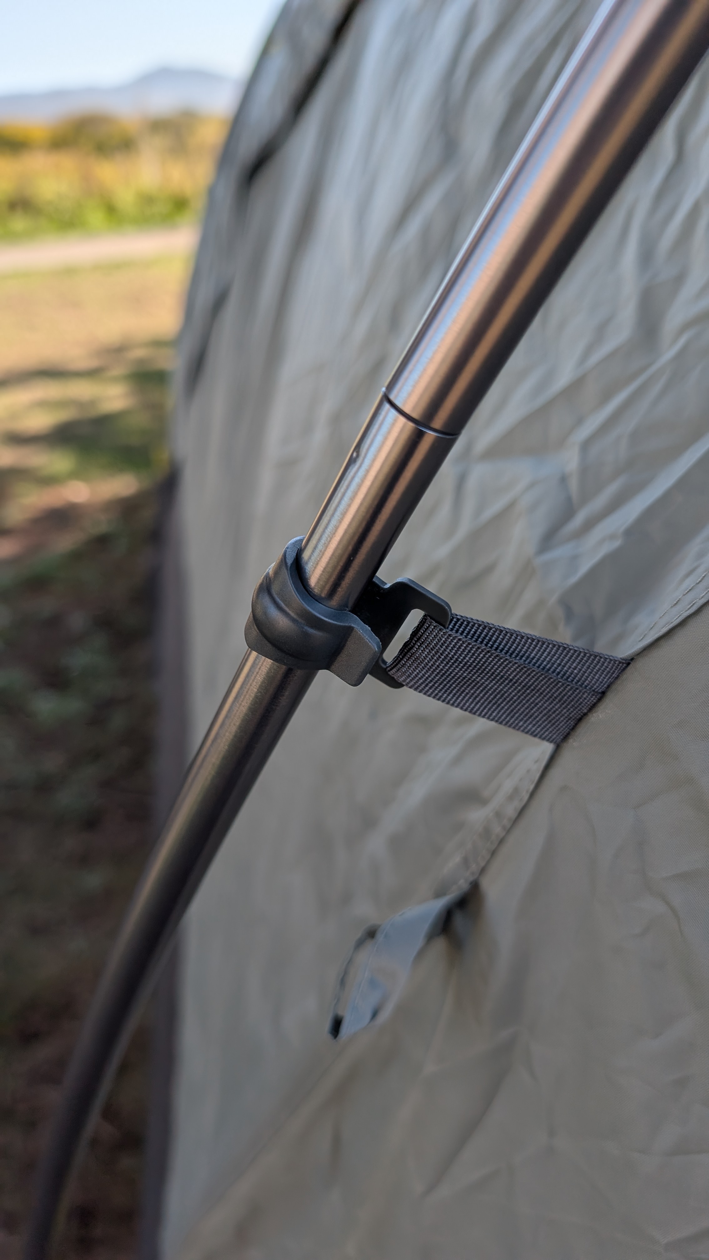 Find the small gray clips on the vestibule fabric and snap them onto the vestibule pole. This tensions the vestibule roof and keeps the fabric from sagging or flapping.