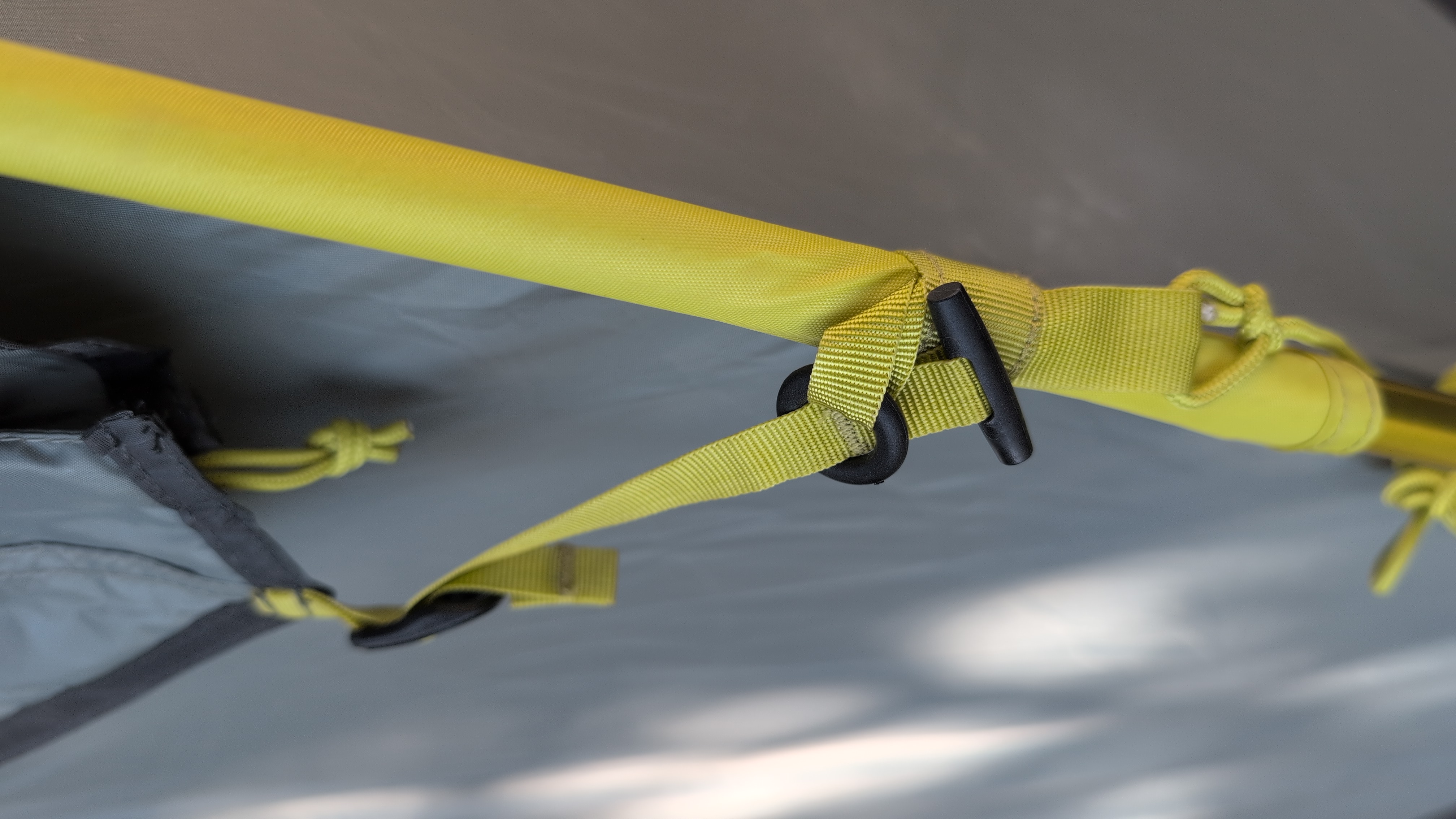 Insert both yellow poles into sleeves before seating ends, and when securing poles use the bottom-crossing pole first, then the top.