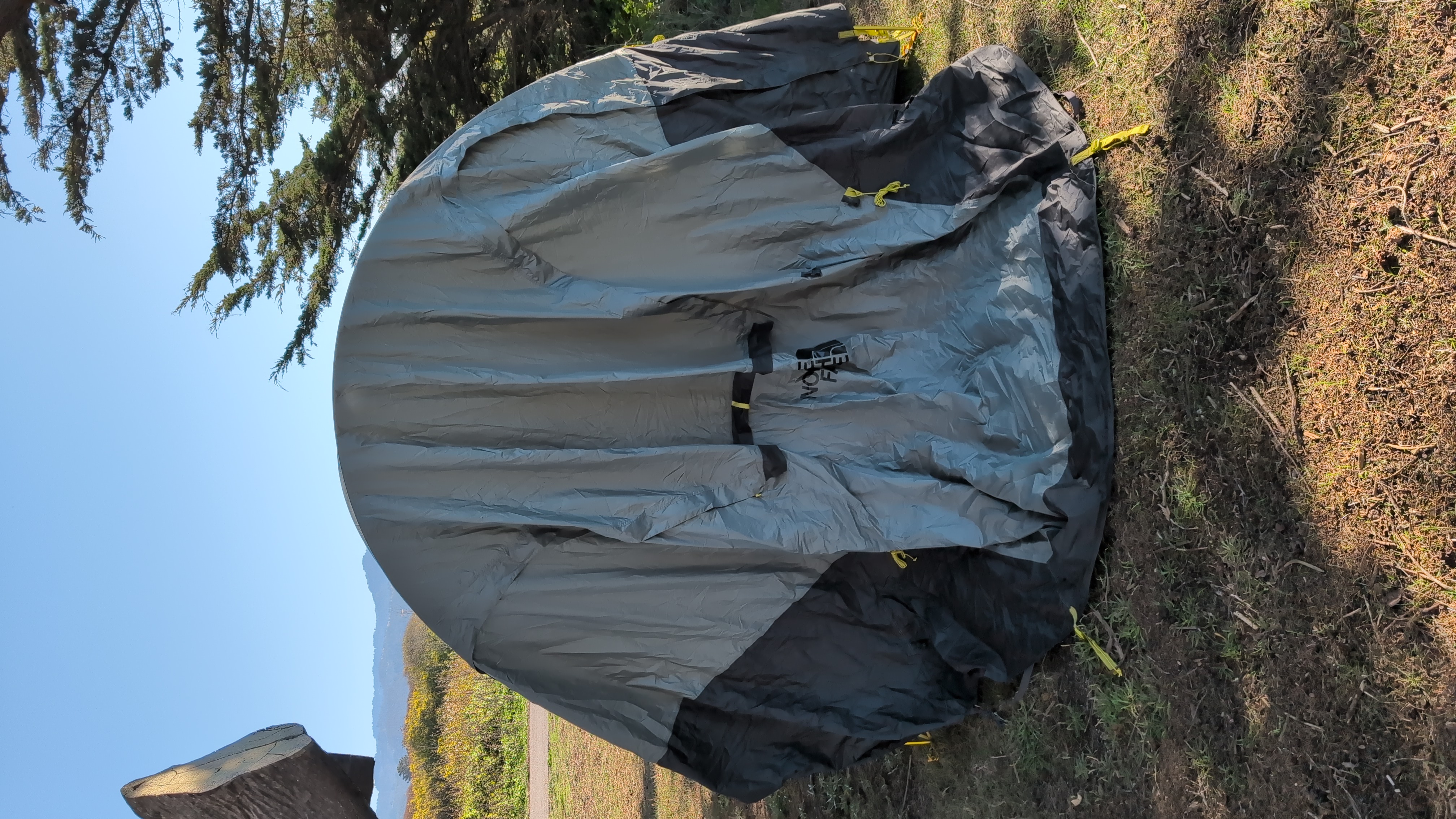 Both the front and back of the rain fly have 'THE NORTH FACE' logos, so you can't use the logo to identify the front. Instead, look for the GRAY SLEEVE above the logo - this is the vestibule pole sleeve and marks the FRONT of the fly. The back side has a logo but no gray sleeve above it.