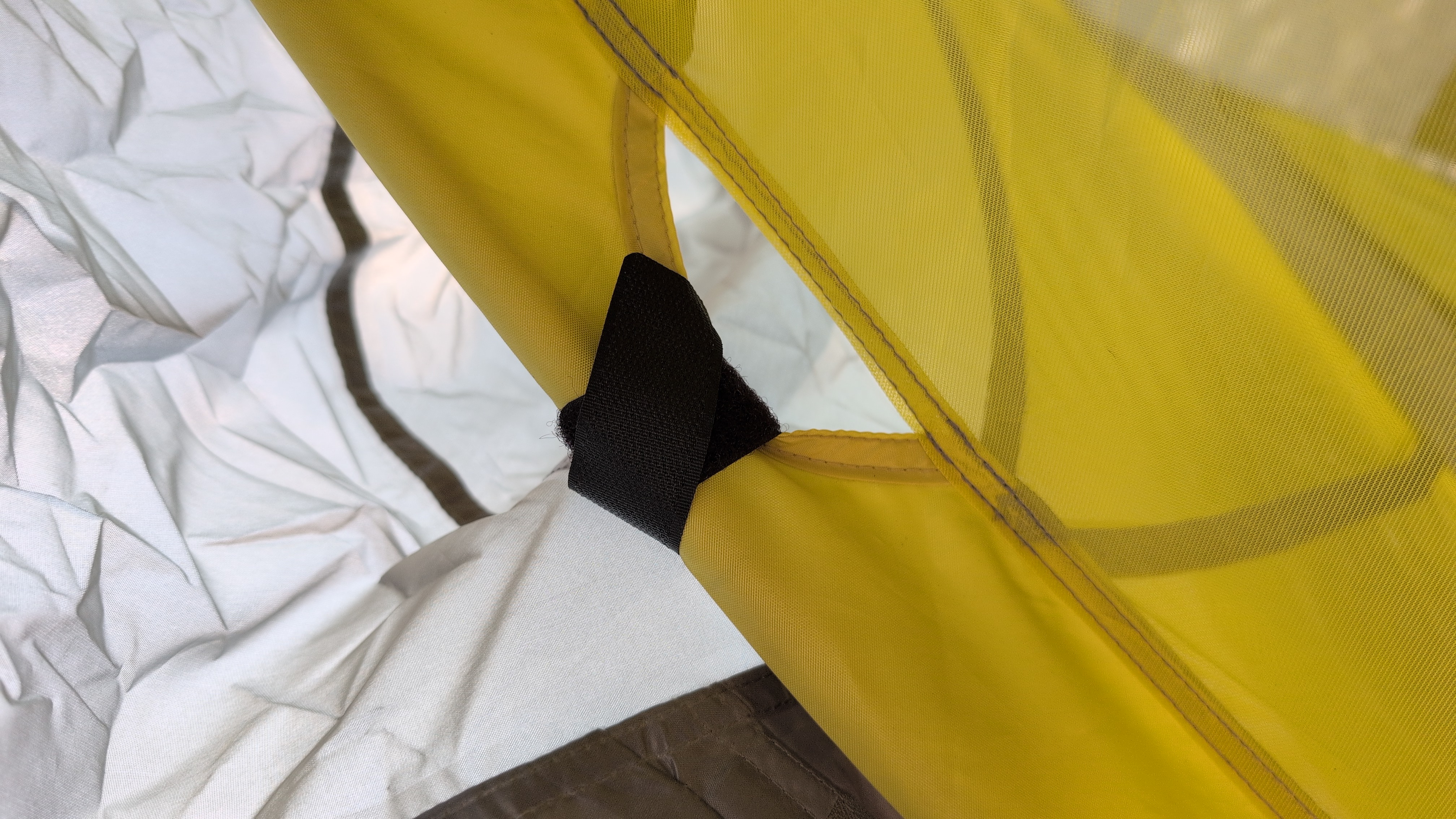Wrap all velcro loops on the underside of the fly (including the center strap) around the poles to stop flapping and keep alignment.