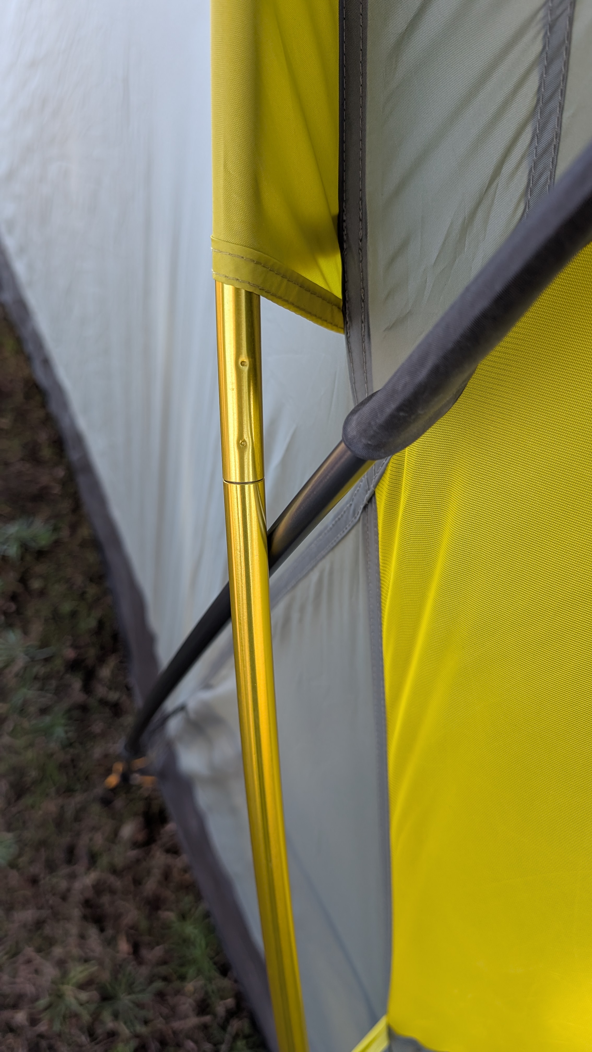 Thread the straight gray pole through the gray sleeve above the front mesh door. Important: The gray pole goes UNDER the yellow pole where they cross. Seat the pole ends into BOTH grommets at each corner - the tent's grommet AND the orange grommet on the ground sheet (which has an orange loop attached). This lifts the front wall to full height.